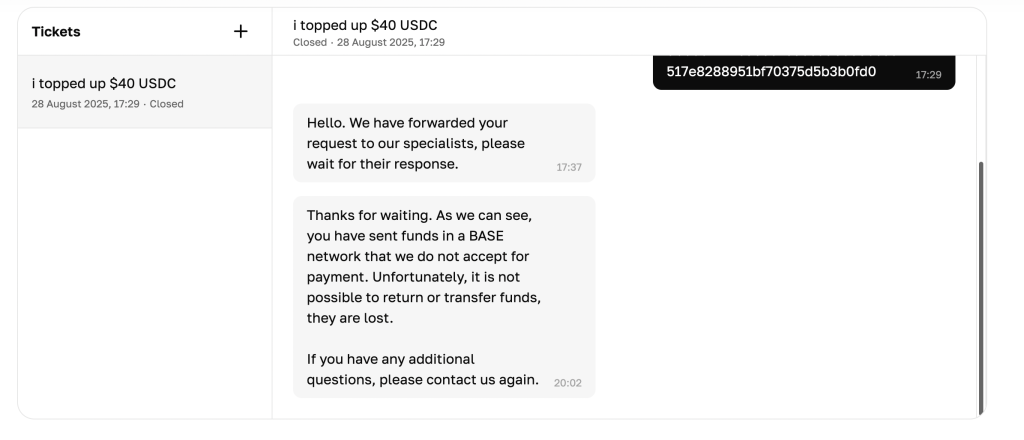 I tried to top up $40 USDC, but instead of using the right chain, I sent it via BASE network, which the platform doesn’t support. A few hours later, I got the dreaded message: